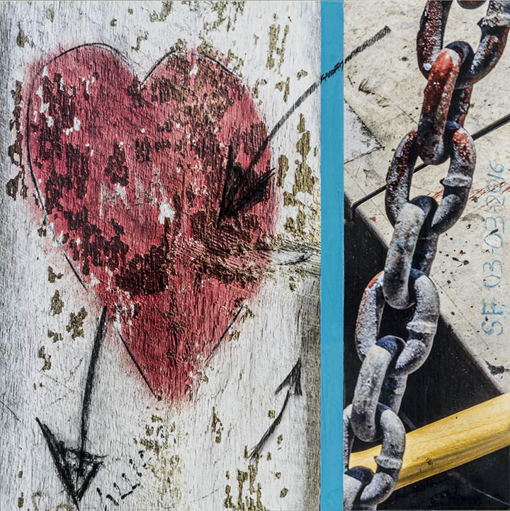 Coeur-Flèche-Chaine_Impression numérique et médiums mixtes_marouflée sur bois_20X20po