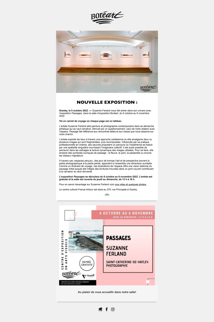 VUE DE L’EXPOSITION PASSAGES, CENTRE CULTUREL YVONNE L. BOMBARDIER, 2017.